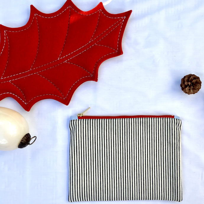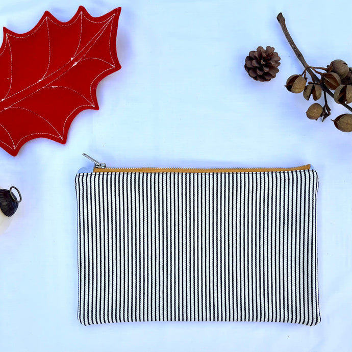 Black and off-white stripe denim fabric Pouch with zip. Zippered purse. Zippered pouch. Cotton and leather. YKK zipper.
