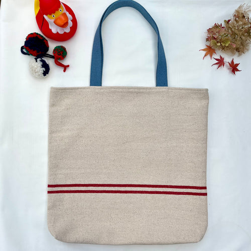 Tote bag. Heavyweight natural woven canvas with two horizontal red stripes. Lined with an ex-designer striped cotton shirting fabric.