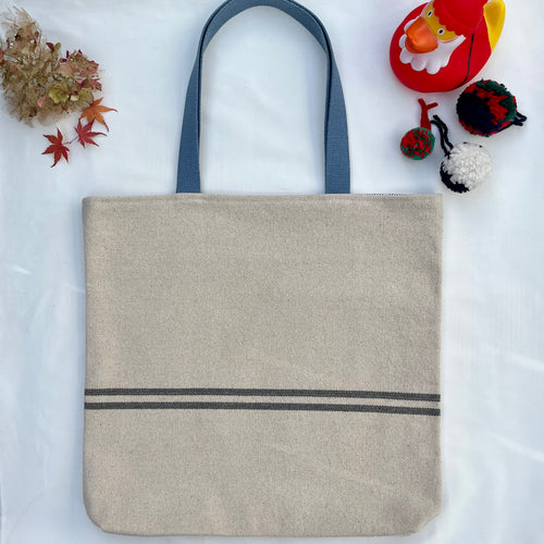 Tote bag. Heavyweight natural woven canvas with two horizontal blue grey stripes. Lined with a beautiful striped cotton shirting fabric.
