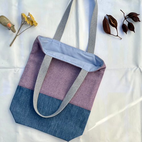 Tote bag. Pale mauve Herringbone pattern wool with a blue cotton denim bottom.