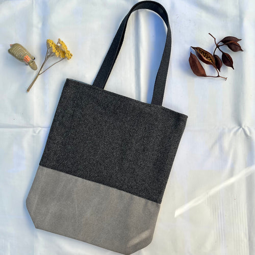 Tote bag. Grey Herringbone pattern wool with a grey washed cotton canvas bottom.