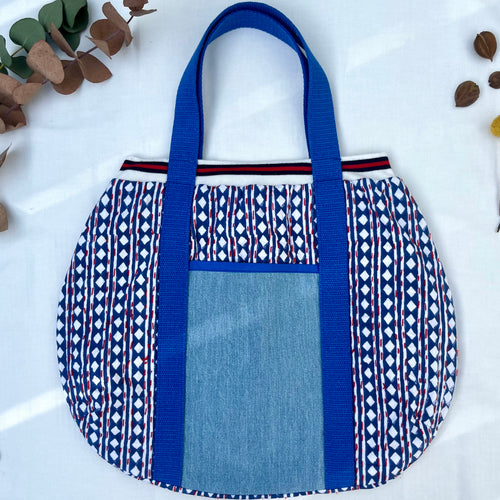 Block print bowling bag. Blue and white cotton print with red visible stitch. Red, navy blue and white knit cuff.