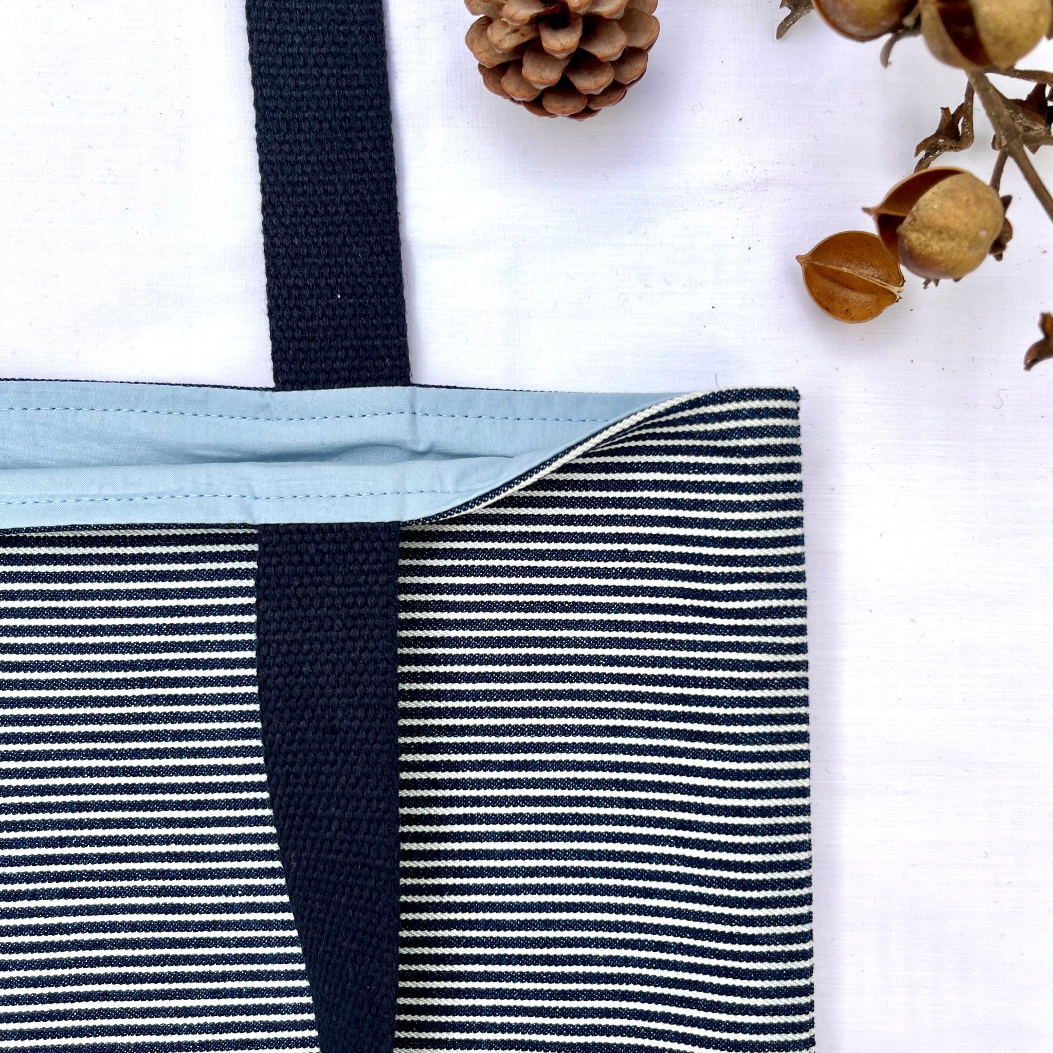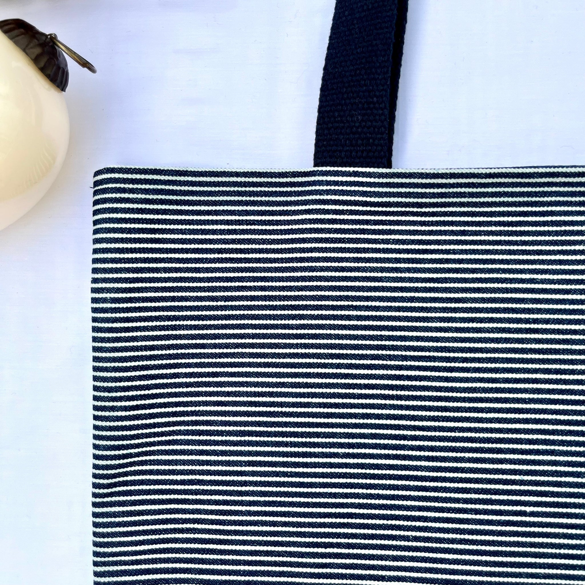 TOP (25.5 cm): Navy blue and white stripe cotton denim. 100% cotton.