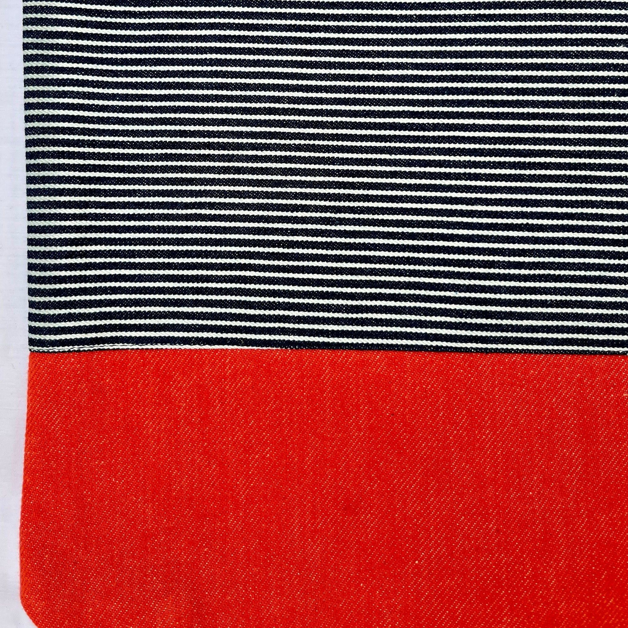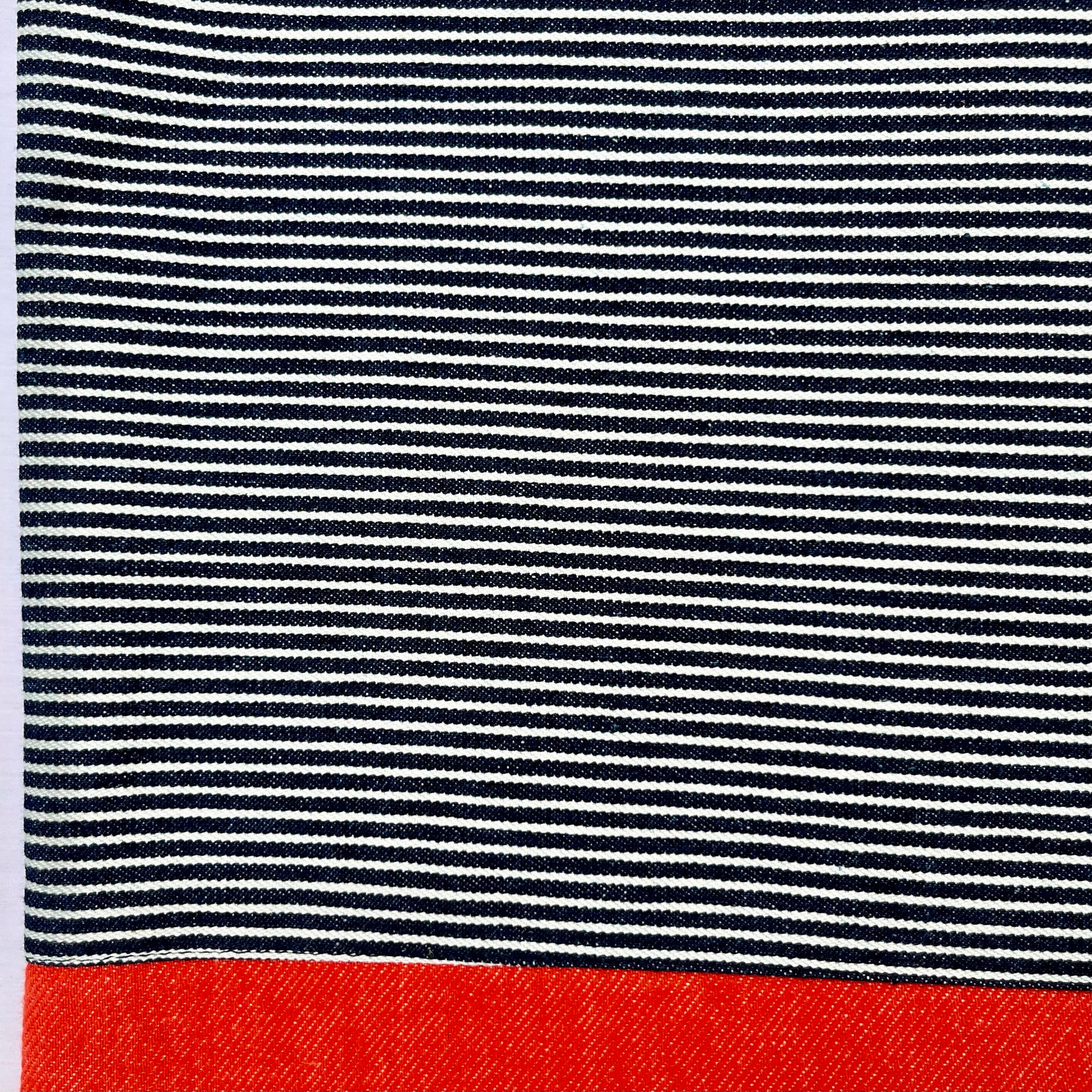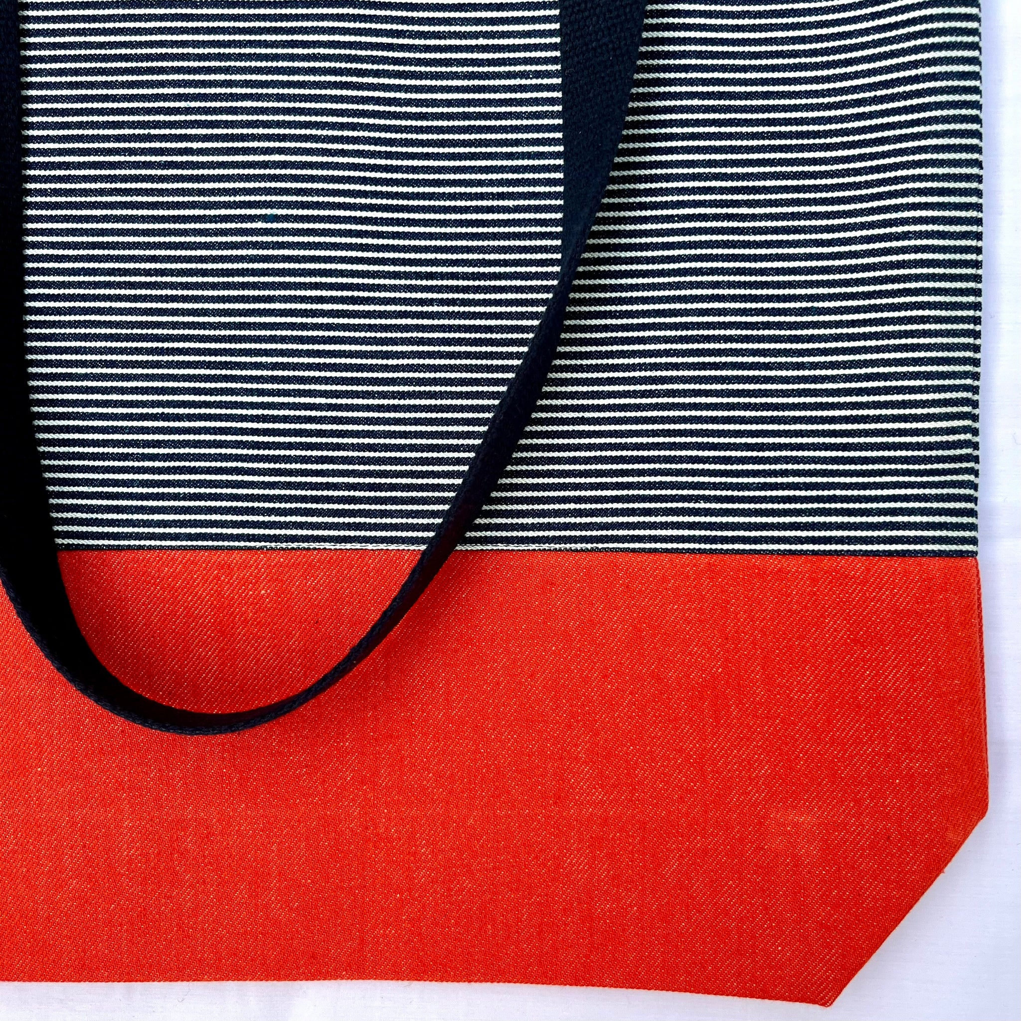 One of a kind bag. Tote bag. Navy blue and white stripe cotton denim with an orange denim bottom.
