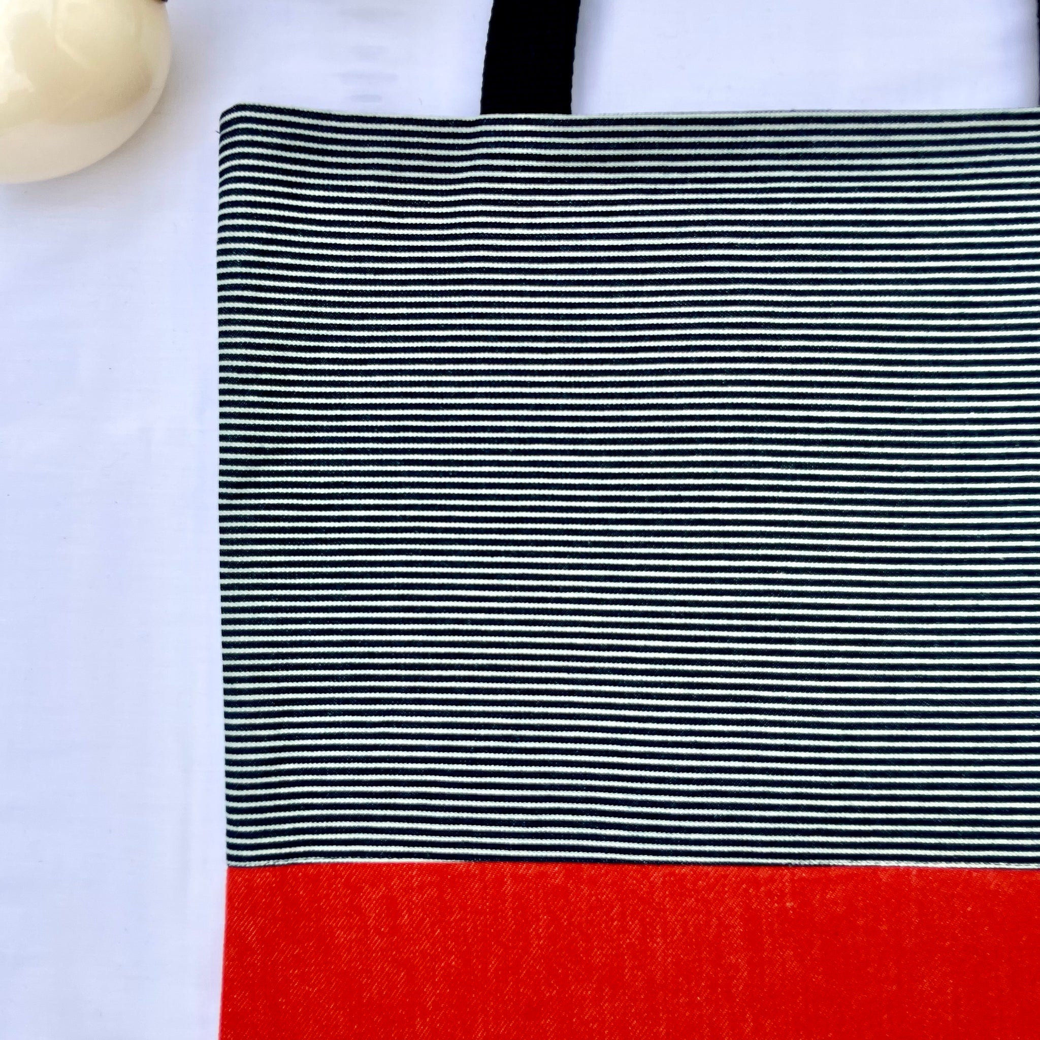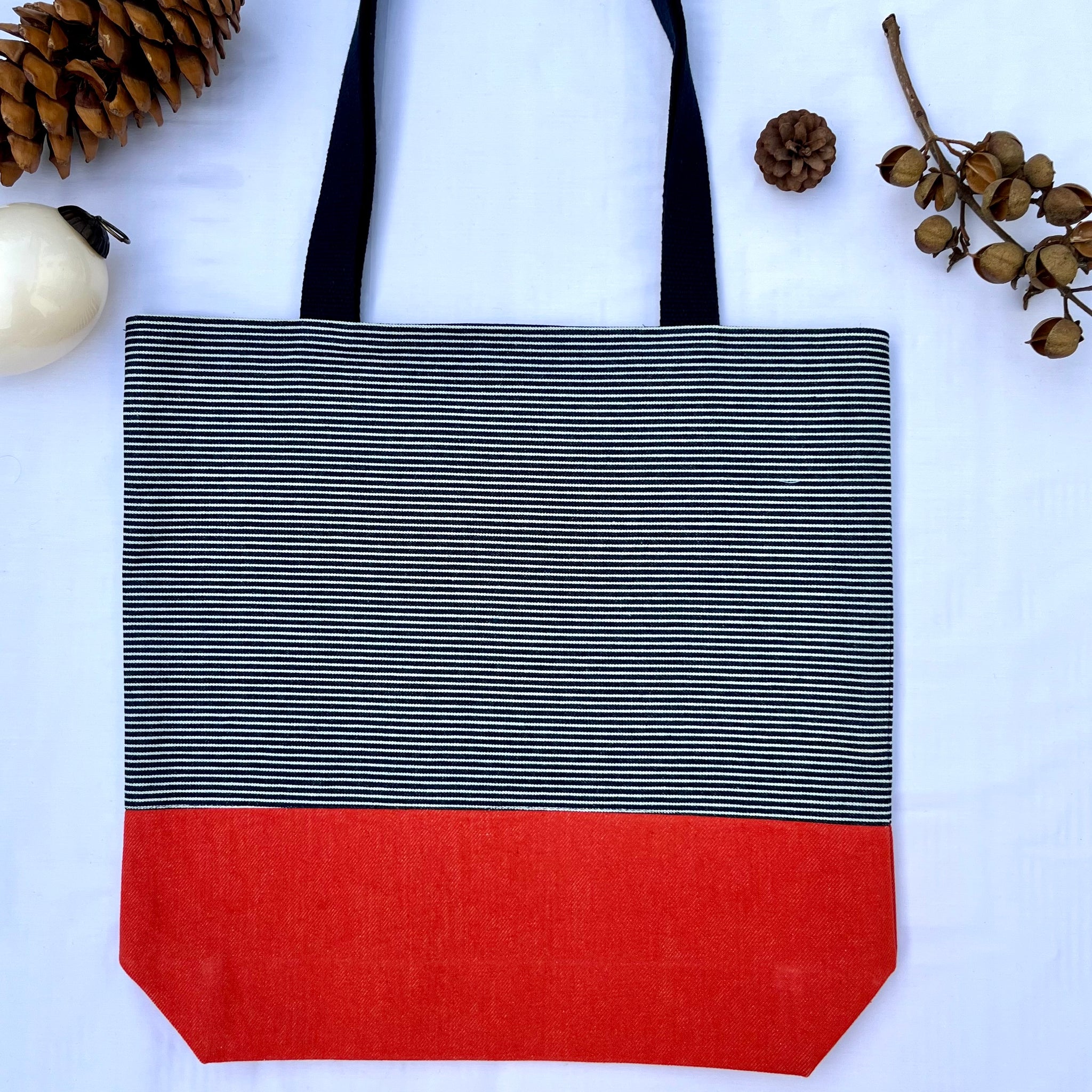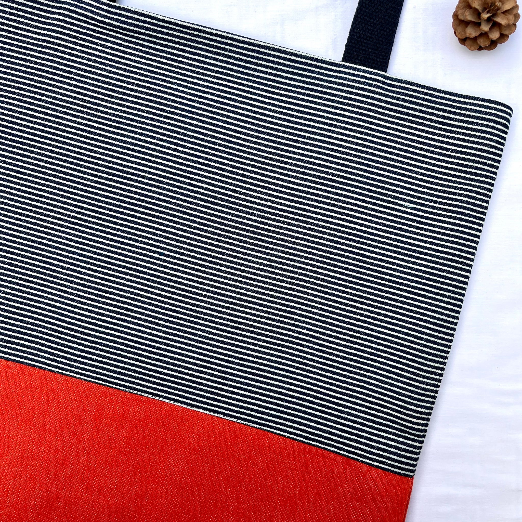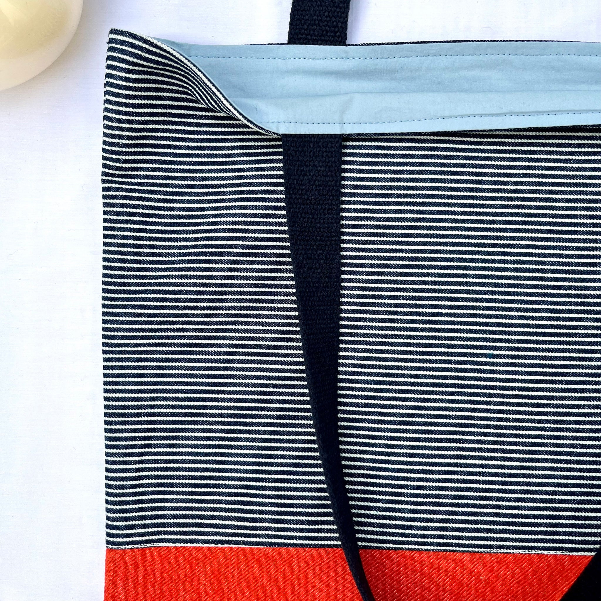 One of a kind bag. Tote bag. Navy blue and white stripe cotton denim with an orange denim bottom.