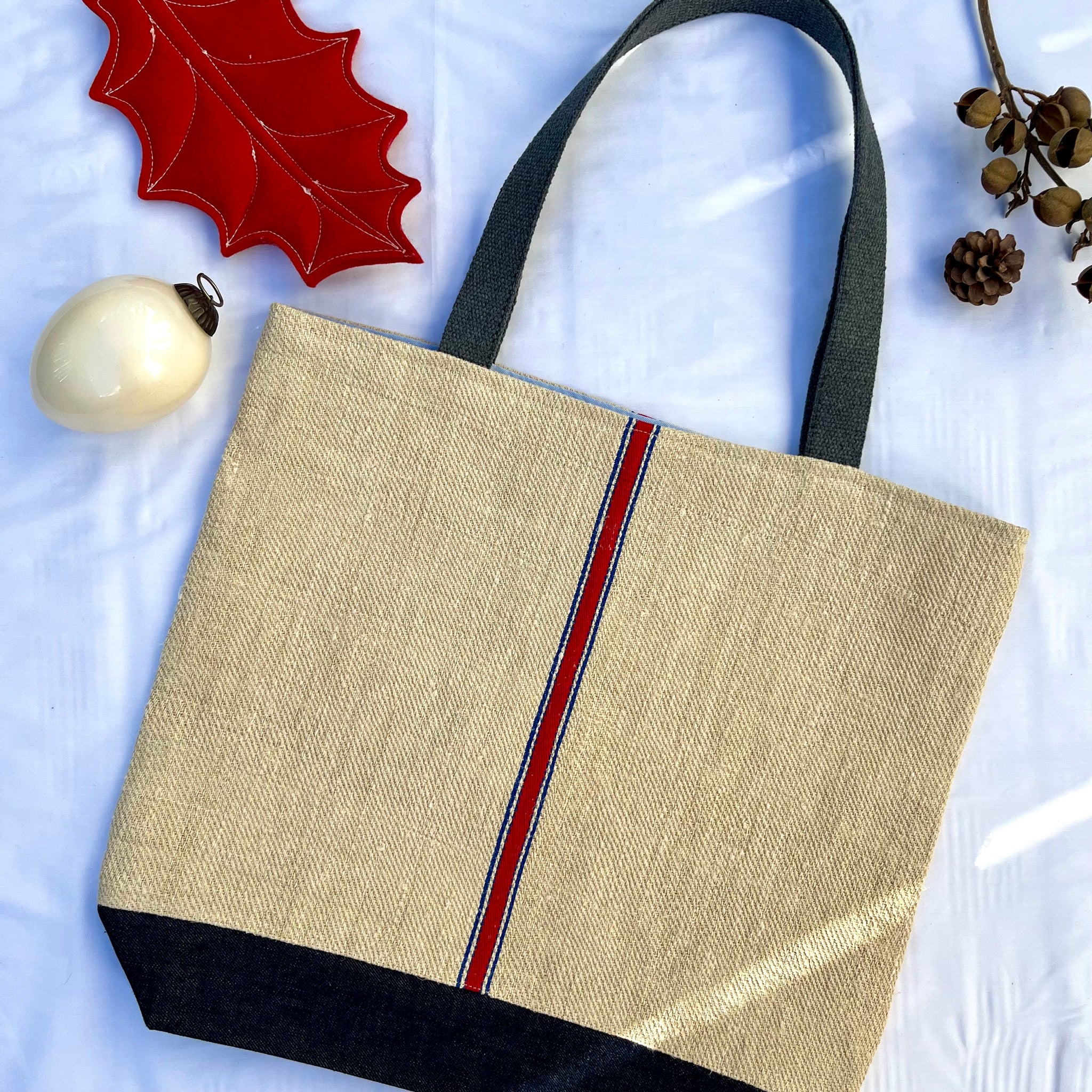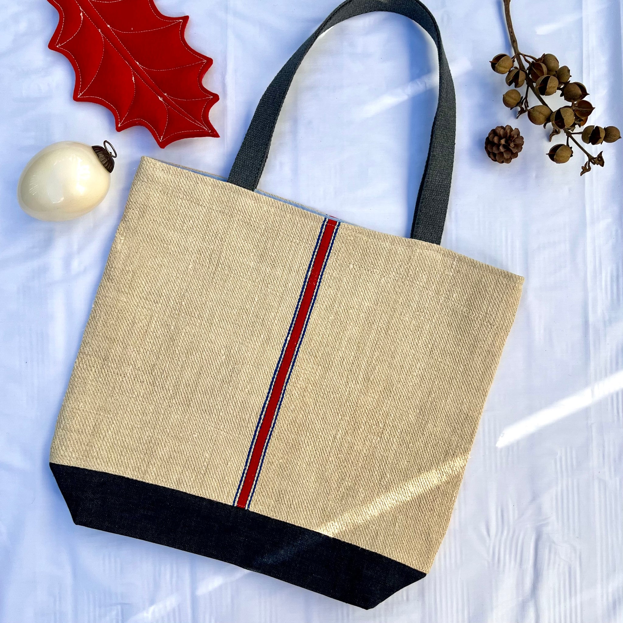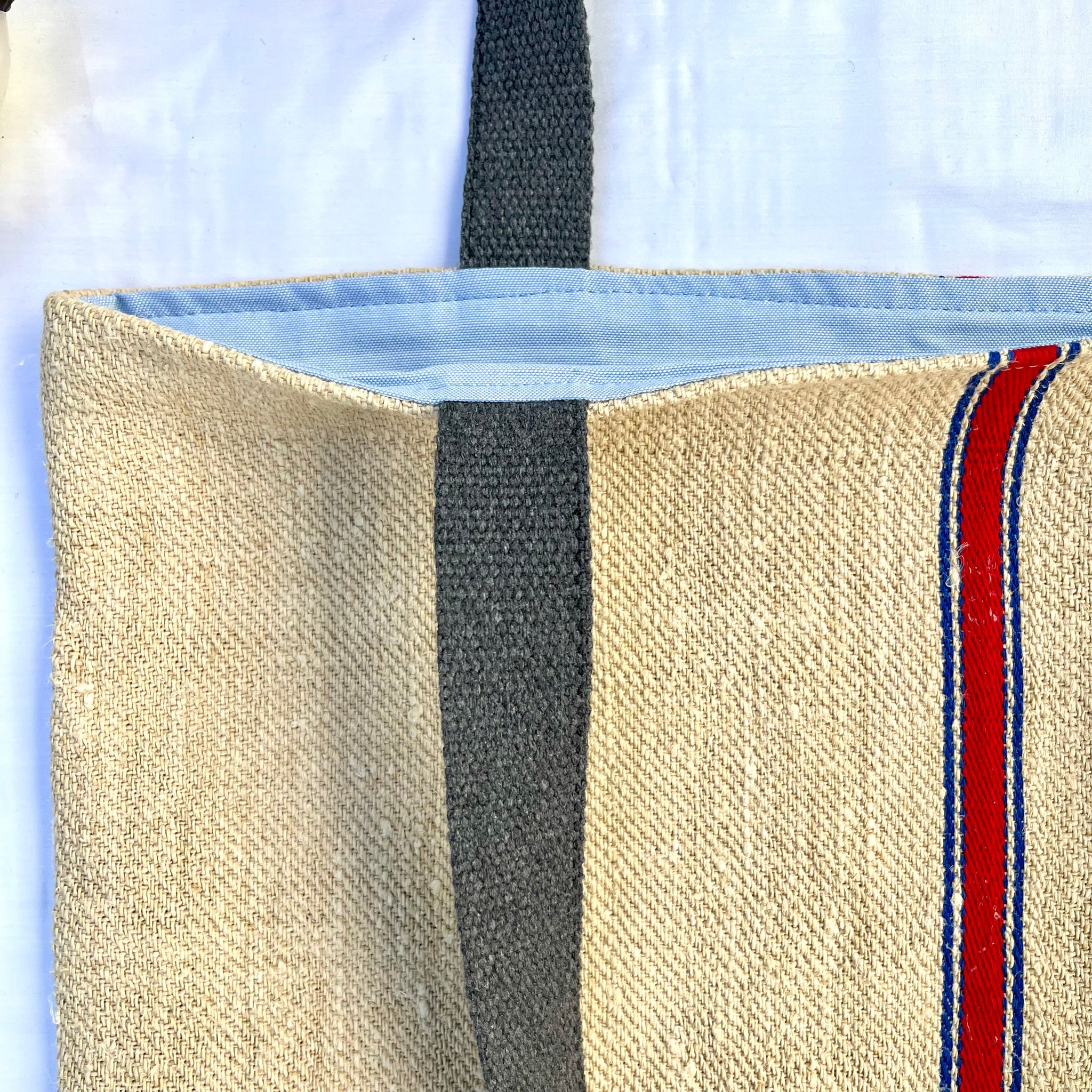 Vintage grain sack tote bag. Vertical blue and red stripes.