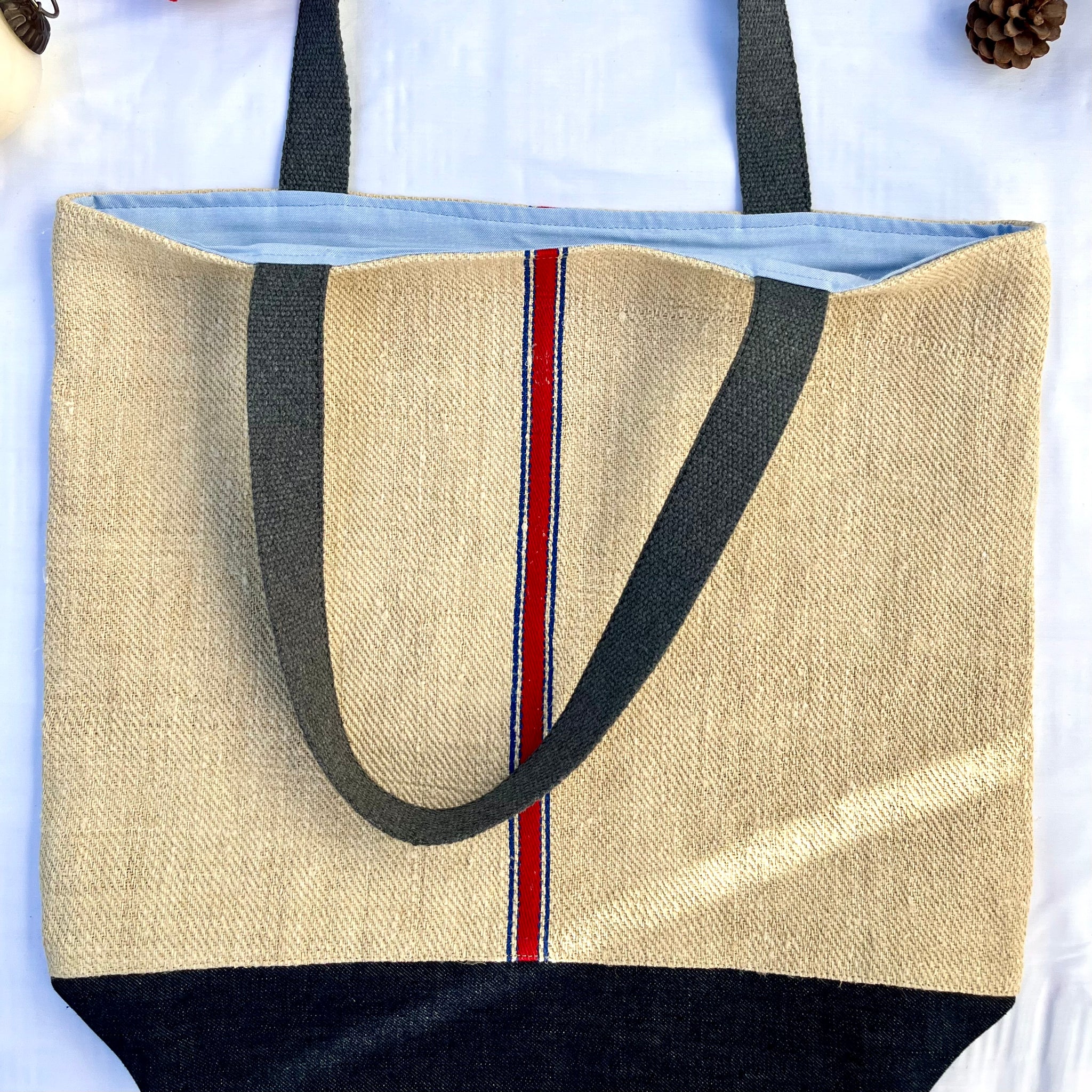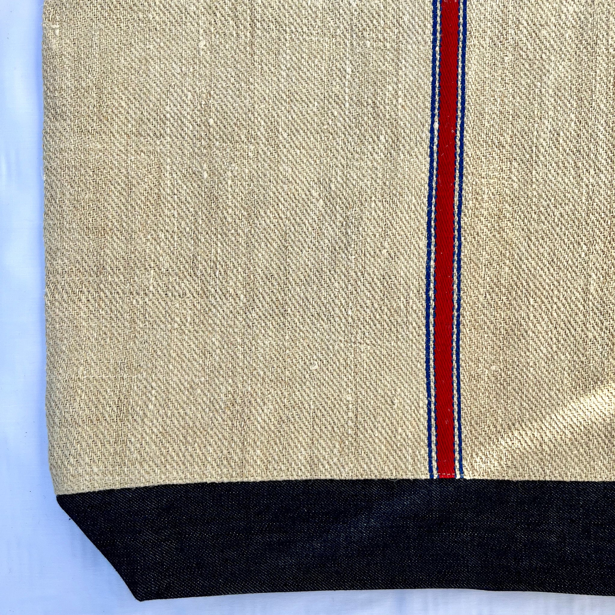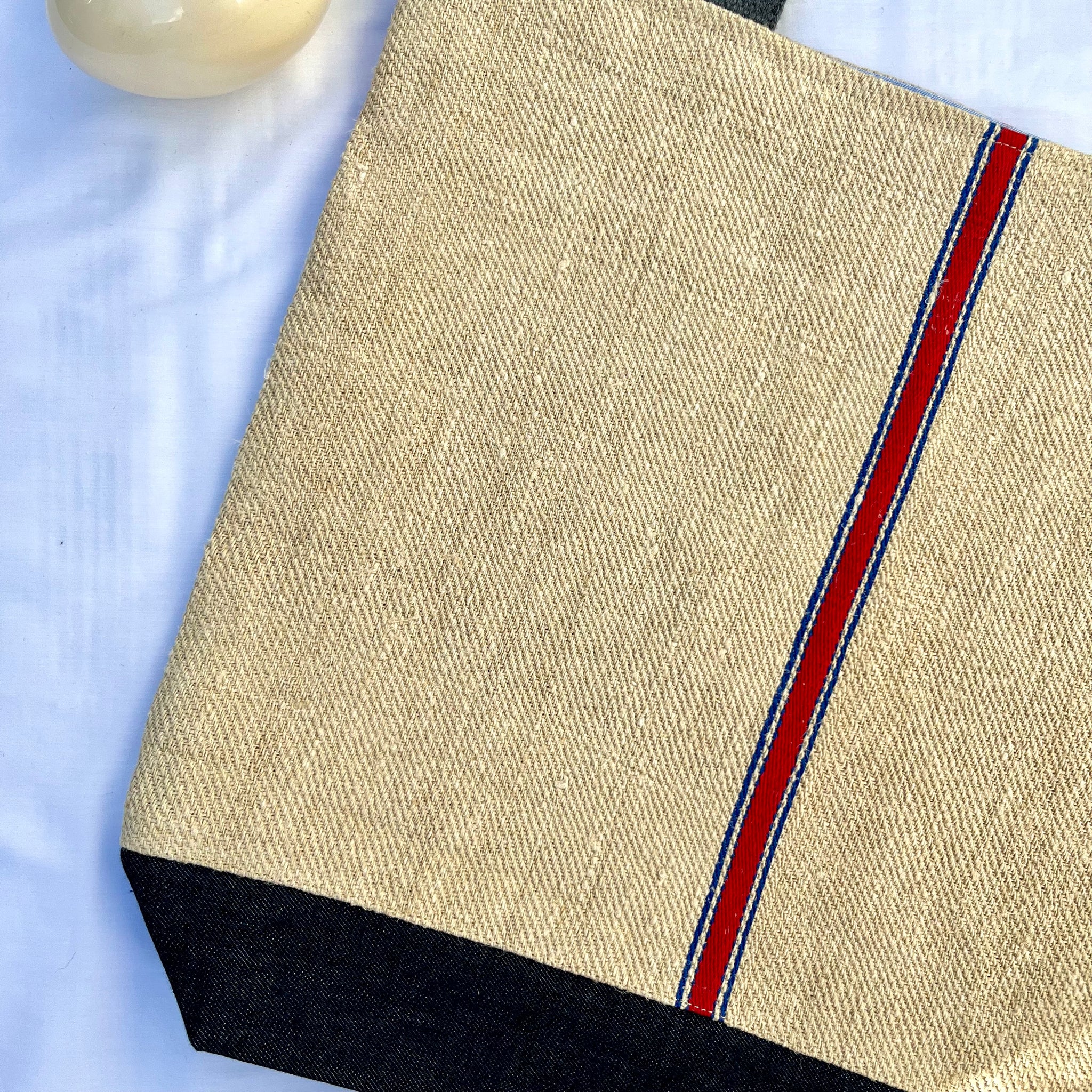 Vintage grain sack tote bag. Vertical blue and red stripes.